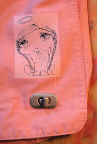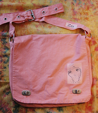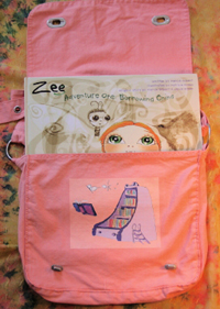 Messenger Bag, Detail (Zee Angel) | Messenger Bag, Open (Zee’s book is 12” x 9”) |
